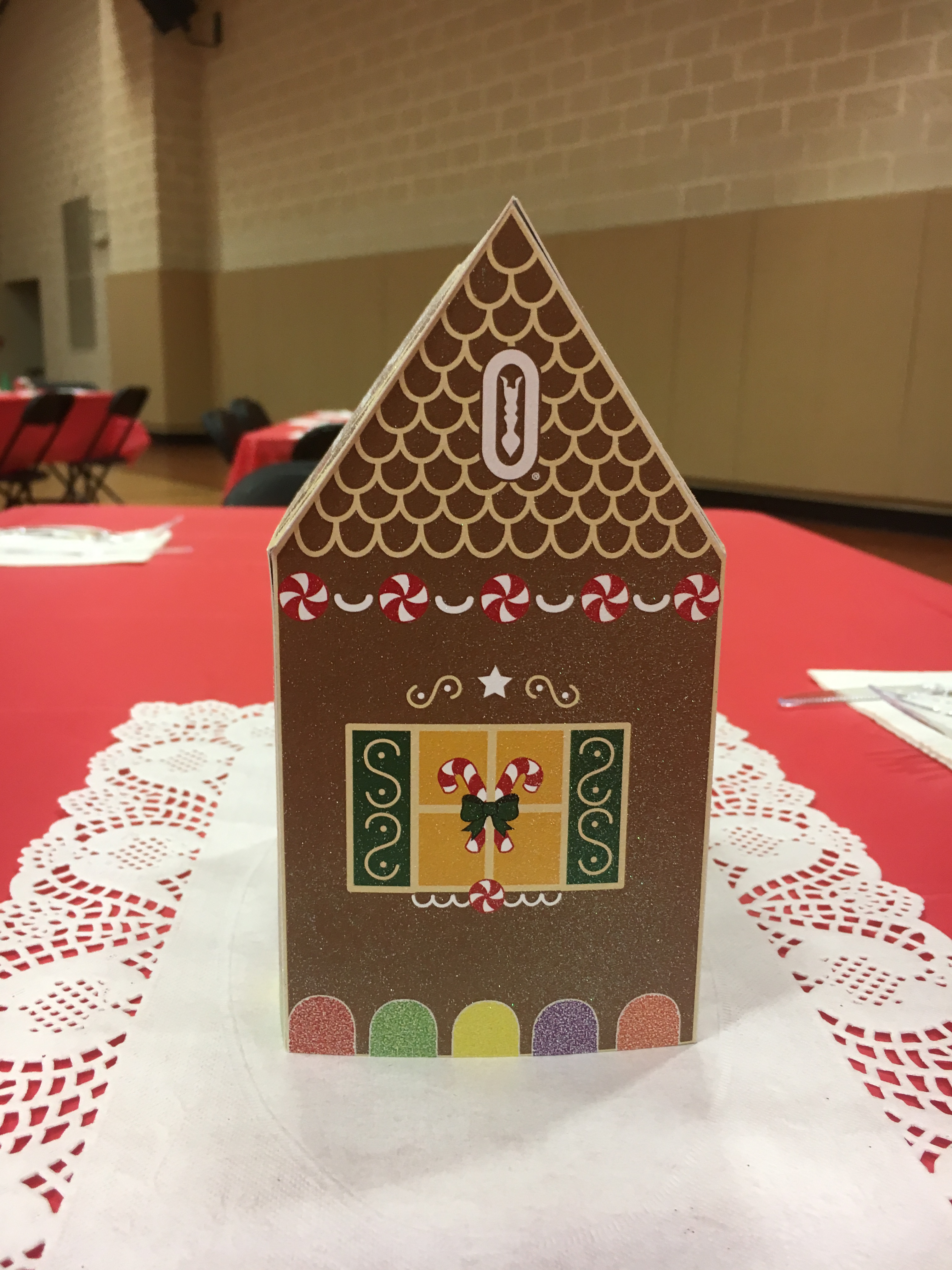 The front side of a paper gingerbread house centerpiece for a corporate holiday celebration.